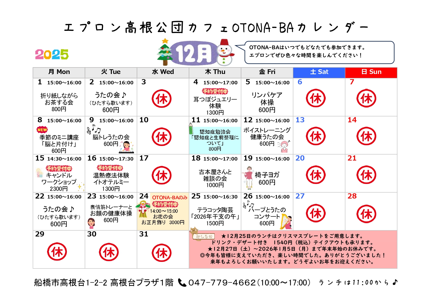 OTONA-BA OTONA-BA 何か始めたいな。1人でやっていても張り合いないな。 用事や行くところがないと家にこもりがちになるものです。 なにより、趣味も1人でやるより仲間がいたほうが楽しいですよね。 気軽にきて、楽しめる。 それがOTONA-BA(旧大人の部活)です。 お茶を飲みながら楽しむ。おしゃべりをする。 これは、脳の活性化にもなり認知症の予防になります。 先生を招いたり、皆で教えあいながら和気あいあいと活動中。 まずはお気軽に体験してみてください。どなたでも、いつでも参加できる気楽な会です。 エプロン高根公団カフェ 〒274-0065千葉県船橋市高根台1-2-2 高根台プラザ1階 営業時間 10:00~17:00047-779-4662 エプロン高根公団カフェ 〒274-0065千葉県船橋市高根台1-2-2 高根台プラザ1階 047-779-4662 instagram facebook お問い合わせ ホームエプロン高根公団カフェ大人の部活介護の講座オレンジカフェブログ法人概要 ホームエプロン高根公団カフェ大人の部活介護の講座オレンジカフェブログ法人概要